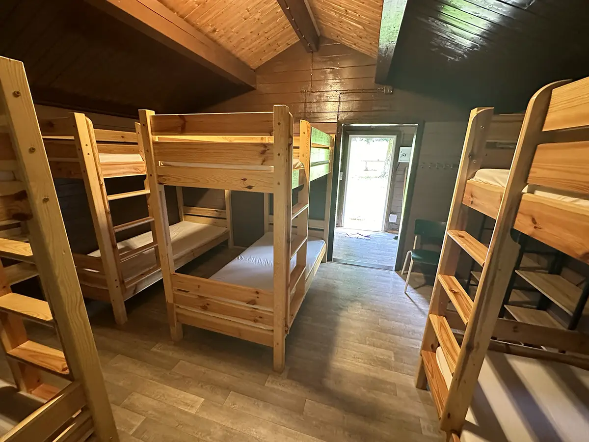 Ausgestattet sind die rustikalen Blockhäuser mit Etagenbetten, Schrankregalen für das Gepäck, einer kleinen Kochstelle und einer gemütlichen Sitzecke. Die Heizung lässt das Blockhaus auch im Winter zu einer warmen und gemütlichen Unterkunft werden.